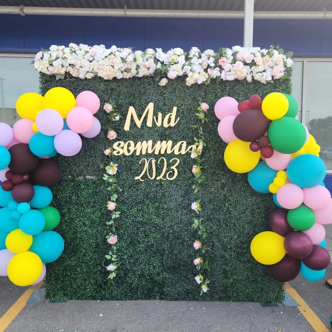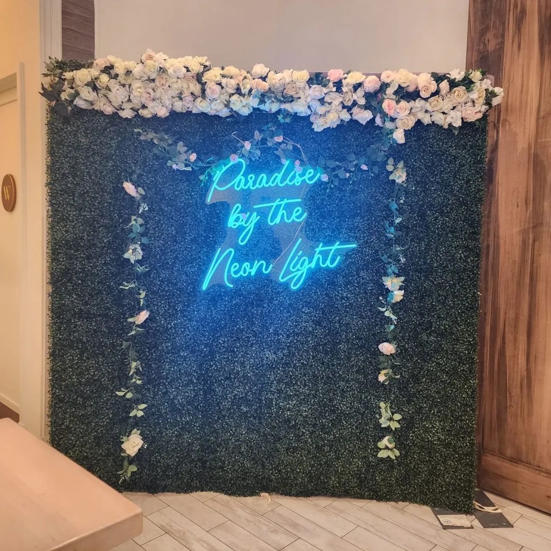 Our Green High Tea Flower Wall rental is one of our most sought-after rentals. Often referred to as a boxwood hedge or green backdrop, this stunning feature is adorned with elegant roses and lush greenery along the top and sides, creating a striking contrast against the vivid green wall. It’s a definite crowd-pleaser among our clients.